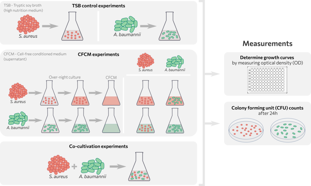 Staphylococcus aureus (Sa) and Acinetobacter baumannii (Ab) are often found together in severe polymicrobial infections resistant to treatment. In this project a combination of wet-lab experiments and in silico modeling was used to explore the interactions, using both, representative laboratory strains and strains co-isolated from clinical samples.
