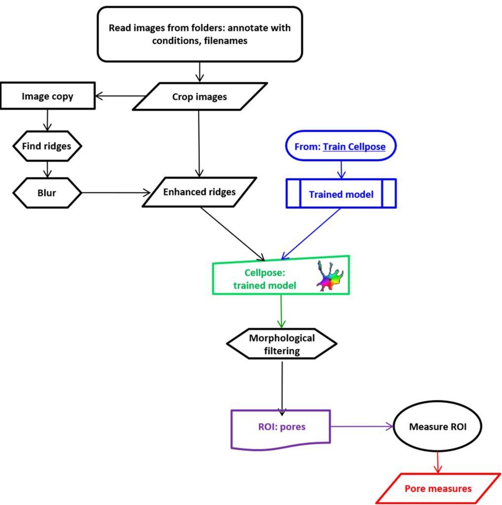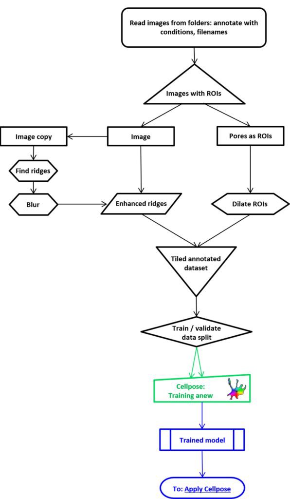 Image preprocessing and Cellpose model training. Images with manually annotated pores were read into memory and separated into images and regions of interest (ROIs), with enhancements improving the visibility of the ridges around the pores. The ROIs were expanded to include the area around the pores and these enhanced images were used to train the Cellpose model. The trained model was then saved and used in the next compartment for pore segmentation.