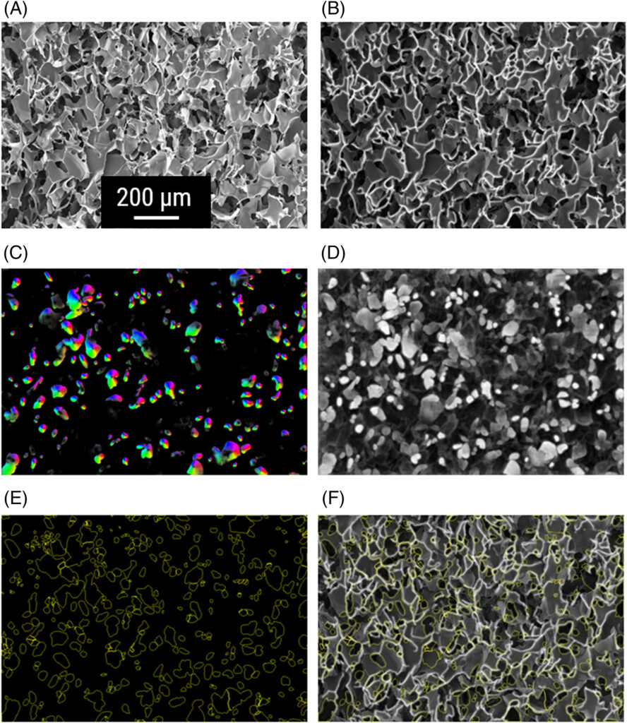 The analysis of electron micrographs was conducted using JIPipe, a software that automates the measurement of pore morphology. This was achieved by integrating classical global and local thresholding methods with a deep learning approach that employed the Cellpose algorithm with transfer learning, thereby enhancing the recognition of pores. The manual annotation and the training of two Cellpose models enabled the precise segmentation and quantification of pore characteristics. This demonstrated that the DL method is more accurate than manual and mercury intrusion porosimetry measurements in providing detailed morphological parameters.